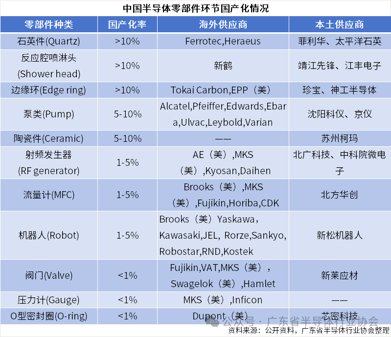 与设备整机市场相比,零部件市场规模不大,但起着以小制大的关键作用。目前,我国石英件、反应腔喷淋头、边缘环的国产化率超过10%,其余零部件自给率均不足10%,阀门、泵类、密封圈基本依赖从美日欧进口。但零部件由于市场呈现小而散的特点,不如设备受资金青睐,需要进一步发力发展。