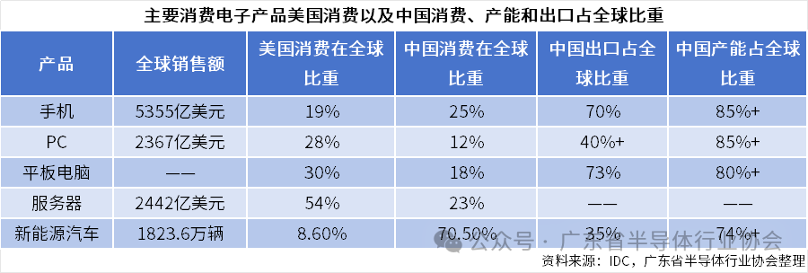 截至目前,不管是在半导体技术还是需求方面,美国始终属于引领地位。凭借美元霸权,美国能够在全球范围内实施经济政策;凭借美元信用,美国成为全球最大的“甲方”。从半导体终端产品来看,美国消费了全球手机、PC、平板电脑、服务器的19%、28%、30%、54%。中国人口是美国的4倍,是这些产品的主要生产国,但在消费上除了新能源汽车领先外,其他人均消费均落后于美国。这或许是美国发动贸易战的底气之一,顾客就是上帝。