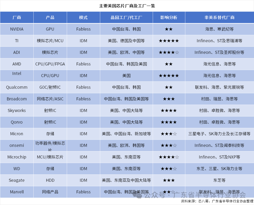 中国的芯片原产地认证规则对于生产布局在美较多的厂商而言,冲击最为明显。其中,最具代表性的美国本土化制造厂商有:TI、ADI为代表的模拟厂商,Intel为代表的CPU厂商,Micron为代表的存储厂商,onsemi为代表的功率器件厂商,Microchip为代表的MCU厂商,Skyworks、Qorvo等为代表的射频IC厂商。AMD、高通、苹果、英伟达、赛灵思等美国Fabless IC设计公司的芯片不受关税政策的影响。