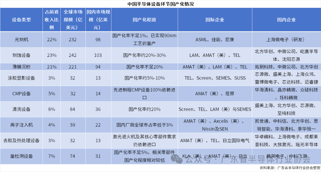 不过,在国内政策利好及外部制裁刺激下,国产厂商正加速追赶,逐步渗透高端设备领域。国产半导体设备公司营收业绩高速增长,市场份额逐步提升。具体来看,我国在去胶、清洗、刻蚀设备方面国产化率较高,在CMP、热处理、薄膜沉积上近几年国产化突破明显,而在量测、涂胶显影、光刻、离子注入等设备上,仍较为薄弱,也成为市场投资的热点。