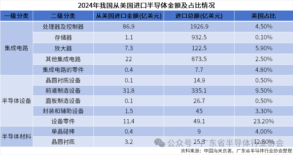 长期看,将促进国内全产业链的自主可控。根据海关总署数据,2024年,我国从美国进口集成电路、半导体设备和半导体材料(单晶硅棒和衬底)的金额为118、45和4亿美元,占进口总额的3%、10%和10%,在部分环节(如英特尔CPU、美光存储、德州仪器模拟芯片等品牌产品,前道制造设备,晶圆衬底等)对美国依存度仍较高,后续国产替代率有望提升。