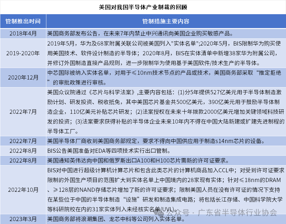 随着中美贸易逆差扩大,美国开始挥动贸易战大棒。2018年,美国制裁中兴,2019年制裁华为简配资,“实体经济”、“缺芯少魂”、“国产替代”成为从上到下都关注的焦点。2022年起,美国不断对中国半导体产业筑起“小院高墙”,持续打压中国科技产业,并通过《美国创新与竞争法案》、《芯片法案》等胡萝卜+大棒的形式引导全球的高端半导体制造回流本土。