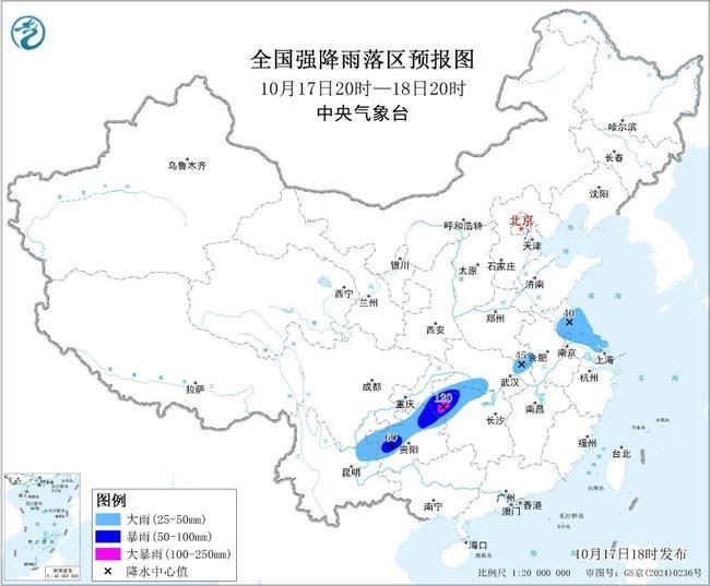 预计,10月17日20时至18日20时,贵州中北部、重庆东南部、湖南西北部、湖北西南部和东北部、江苏中南部、云南东北部等地部分地区有大到暴雨,其中,湖南西北部、重庆东南部等地局地有大暴雨(100~120毫米)。上述部分地区伴有短时强降水(最大小时降雨量20~40毫米,局地可超过50毫米),局地有雷暴大风等强对流天气。